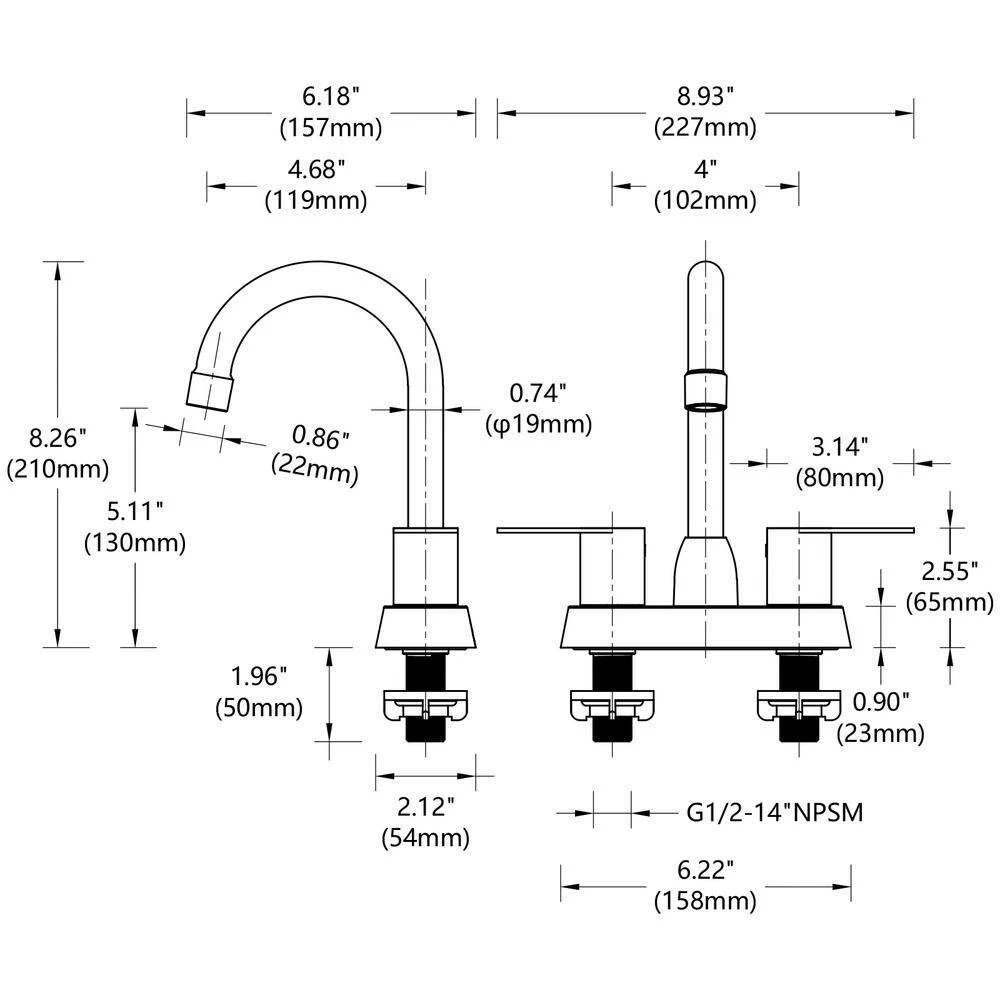 - Height: 8.26 in.; spout height: 5.11 in.; spout reach: 4.68 in.