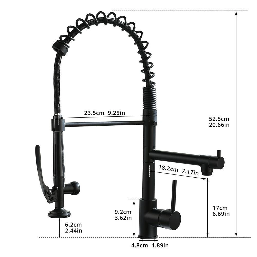 The FLG Commercial Kitchen Faucet Pull Down Sprayer in Black features a high-quality construction made entirely of brass, ensuring lead-free, corrosion, and rust-resistant properties. Its stainless steel body with a brushed nickel finish resists water spots and fingerprints, maintaining a clean and beautiful appearance. Designed with a heavy-duty structure and a blend of contemporary industrial style and sophistication, this faucet is perfect for kitchen renovations, especially in large sinks or granite countertops. It boasts dual functionality with a pull-down sprayer and a pot filler spout, both capable of independent operation in dual-sink setups. The sprayer features a clip for hands-free use, delivering a powerful spray for efficient washing, while the pot filler provides an aerated stream ideal for filling large pots and pans. The single-handle design allows for 360° swivel access to the entire sink, with both the sprayer and pot filler spout also capable of 360° rotation. Easy care and cleaning make this faucet an excellent choice for any kitchen.