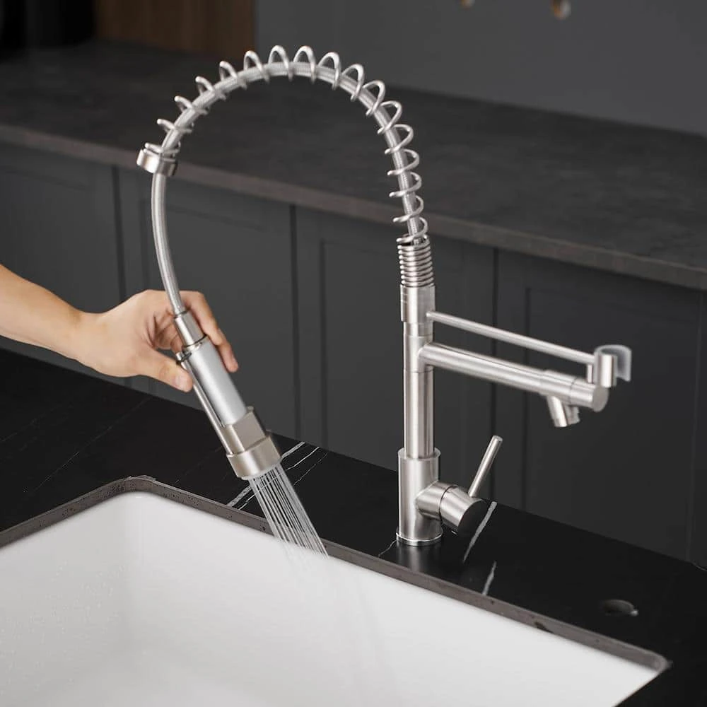 Introducing the Commercial Kitchen Faucet with Pull Down Sprayer, crafted from high-quality SUS304 stainless steel ensuring lead-free safety. Featuring a convenient dual-function setting that allows for easy selection between a stream and spray mode, enhanced by a 360° rotation for unparalleled versatility in washing hands, dishes, and more. The single lever handle makes adjusting water pressure and temperature a breeze. The nickel finish resists fingerprints and corrosion, ensuring easy daily cleaning with a cloth. With its brushed nickel exterior and food-grade PEX inner hoses, this faucet not only looks sleek but also promotes healthy living. The ceramic disc valves surpass industry standards for durability. Its high-arch spout design, reminiscent of a gooseneck, offers ample space for various sink activities, ideal for kitchens, laundry rooms, farmhouses, restaurants, campers, and trailers.