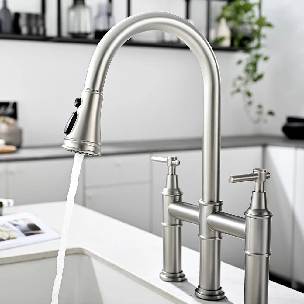 - Bridge faucet aesthetic: a horizontal bar connects the hot and cold water handles to the faucet spout, offering a bold, classically-inspired look