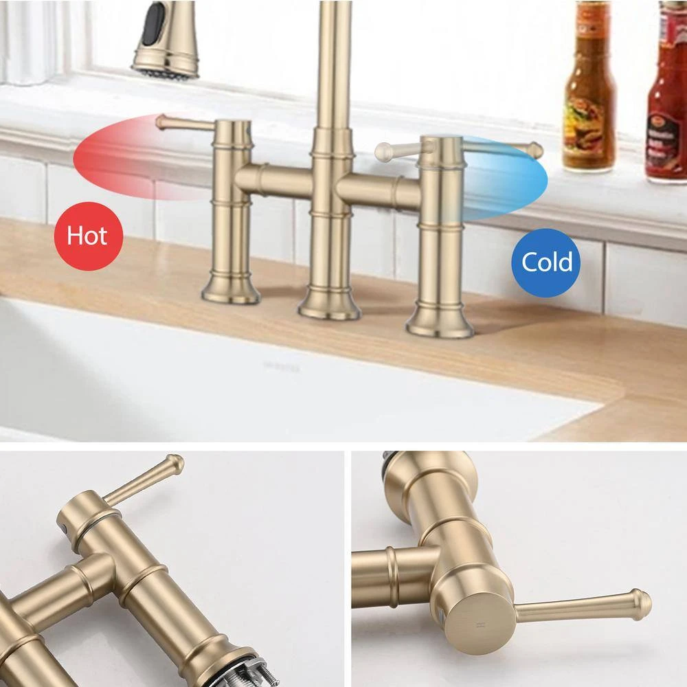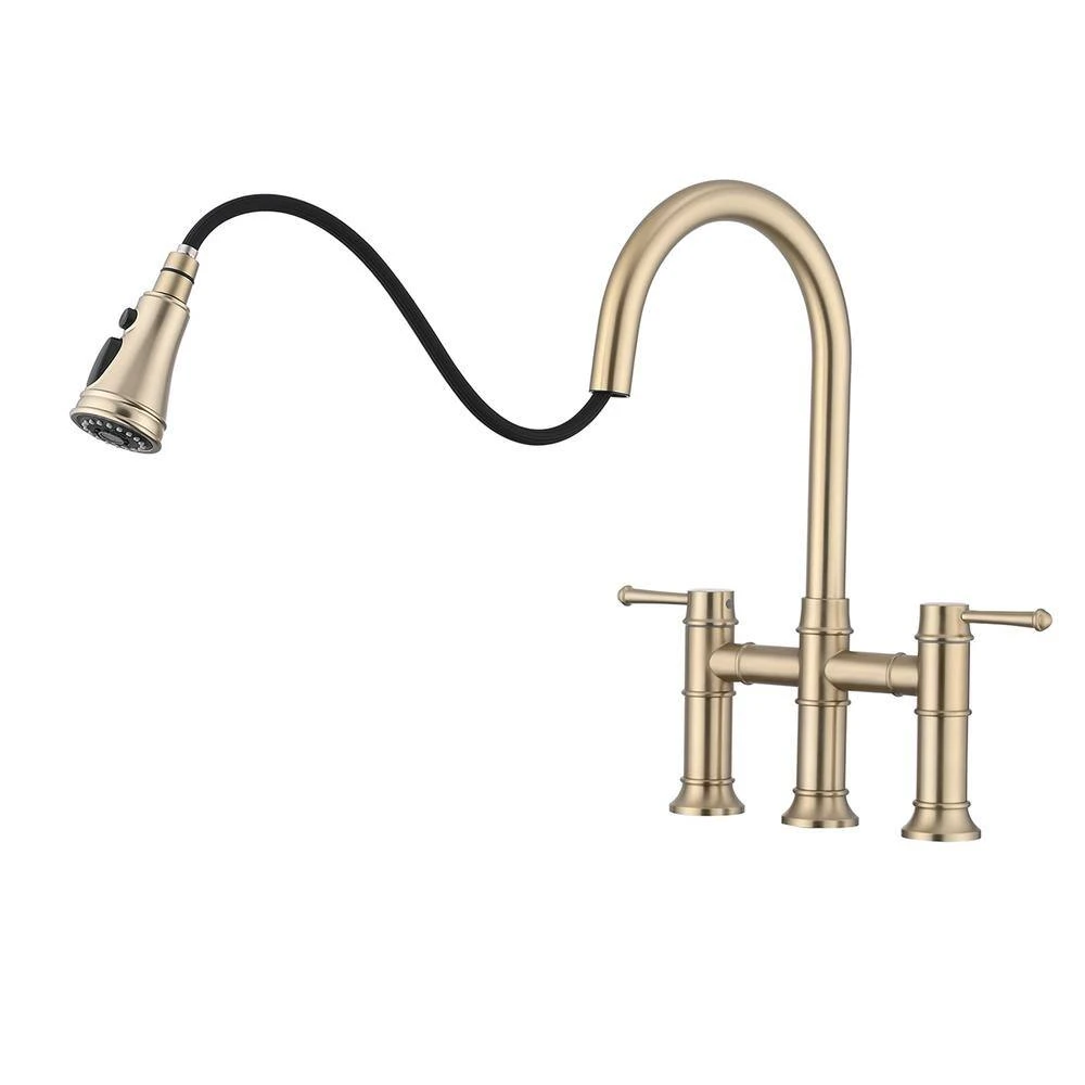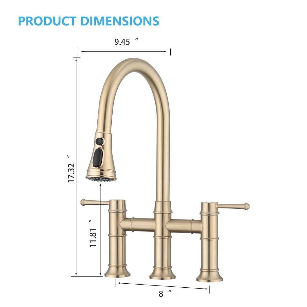 This sophisticated kitchen faucet merges the functionality of a pull-down faucet with the timeless charm of a bridge faucet, creating a transitional design that enhances any kitchen’s aesthetic. The gooseneck spout provides ample clearance, making it easy to fill tall pitchers and pots, while its 360° swivel feature ensures a broad range of motion for versatile use. Crafted from premium SUS 304 stainless steel, this faucet boasts exceptional durability and is resistant to corrosion, fading, and tarnishing over time, ensuring it maintains its sleek appearance. The pull-down nozzle, equipped with three distinct functions, offers maximum flexibility, allowing it to reach all those hard-to-access areas in and around the sink. The double handle design provides precise control over water temperature and flow, enhancing convenience and functionality. With an overall height of 17.32 in. a spout reach of 9.45 in. and a spout height of 11.81 in. this faucet blends elegant curves and decorative details, achieving a perfect balance between classic and modern styles, and adding a fashionable, novel touch to your kitchen.