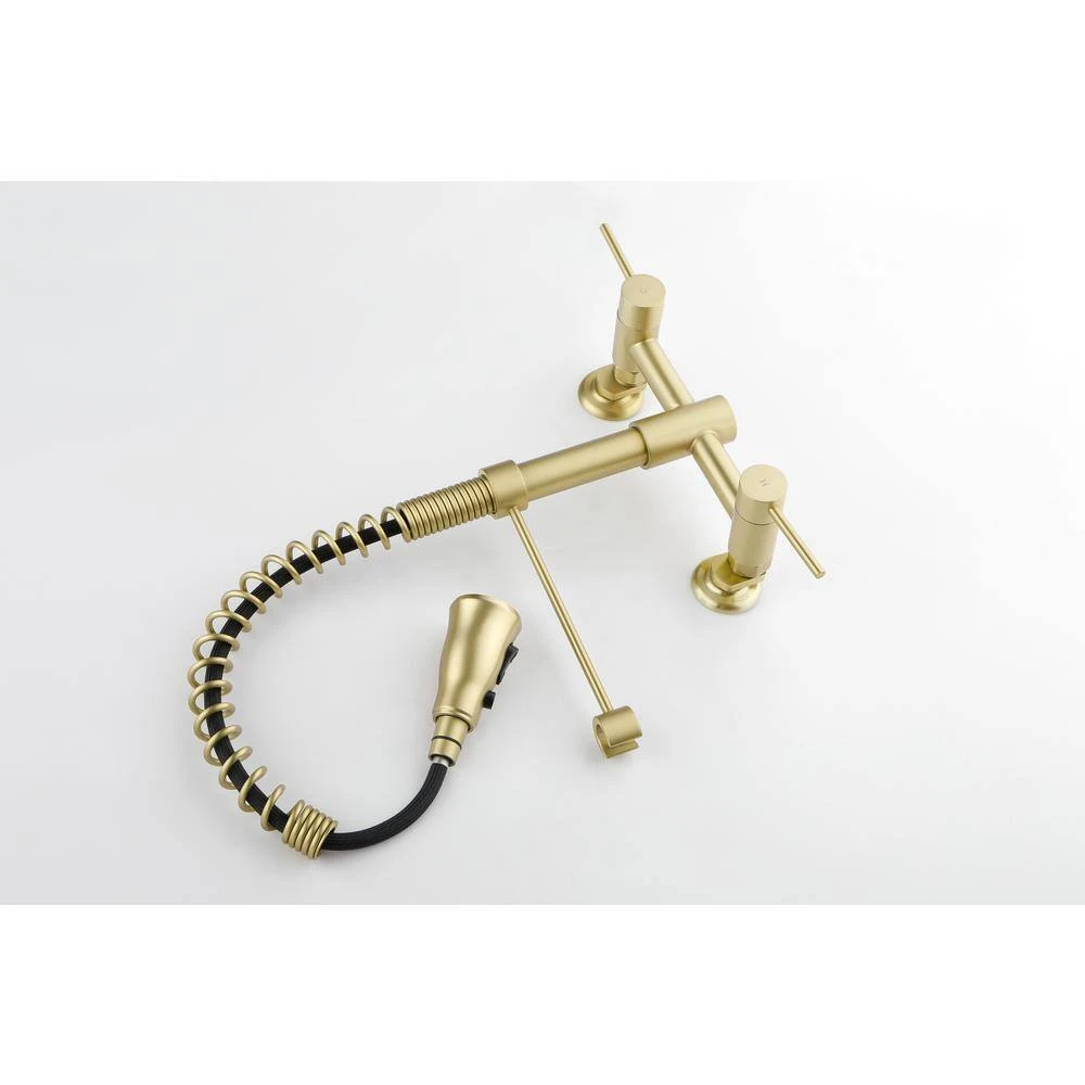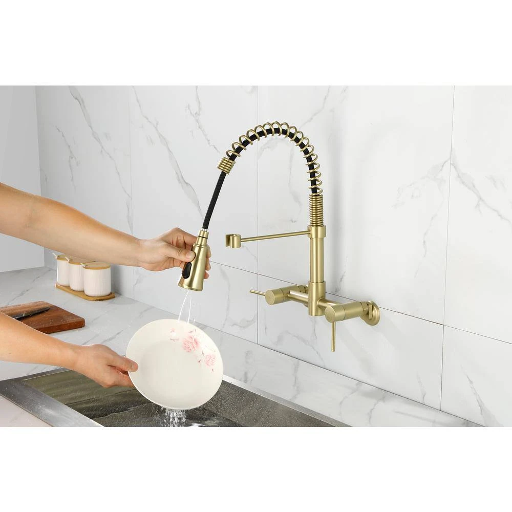 This kitchen faucet is designed for convenience and versatility, featuring a high-arc spout that rotates 360°, allowing for a full range of motion to make washing tasks effortless. The pull-down nozzle offers 3-different spray functions, ensuring flexibility and ease in handling various cleaning needs. With dual lever handles, you can easily adjust both the water volume and temperature for precise control. Additionally, the wall-mounted design helps save valuable counter space, making it an ideal choice for optimizing kitchen layout while maintaining functionality and style.