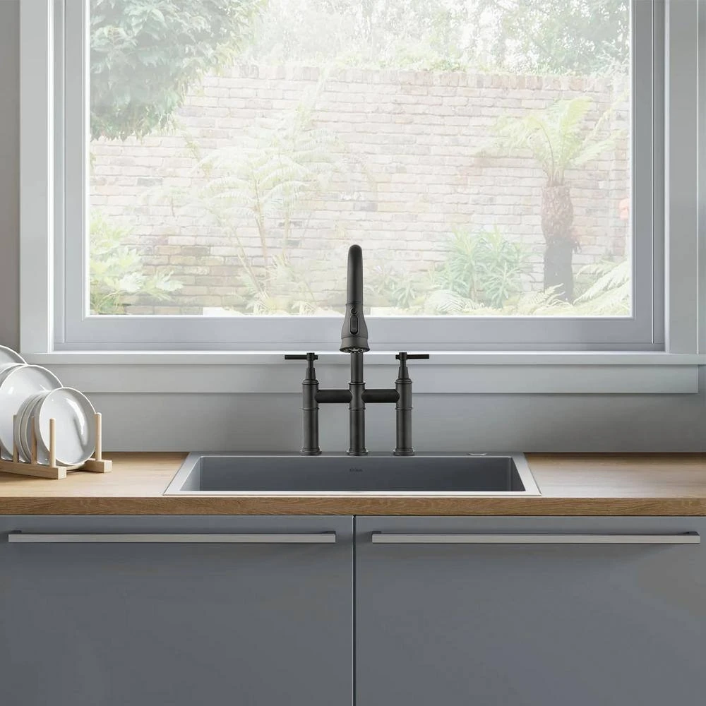 This elegant kitchen faucet offers a blend of modern functionality and classic design, perfect for elevating any kitchen space. The gooseneck spout provides ample clearance for filling tall pitchers and swivels 360 degrees, offering a wide range of motion for versatile use. Crafted from premium SUS 304 stainless steel, the faucet is highly durable and easy to clean, with a corrosion-resistant finish that will not fade or tarnish over time. The pull-down nozzle features three functions, allowing maximum flexibility and ease when reaching hard-to-reach areas around the sink. With double handles for separate control of hot and cold water, this faucet ensures both convenience and precision. Boasting a maximum flow rate of 1.5 GPM, a spout reach of 8.85 in. and a spout height of 9.25 in. this faucet combines practicality with elegance. Weighing just 7.83 pounds, it brings a transitional style to any kitchen, seamlessly blending classical and modern elements for a sophisticated, fashionable look.