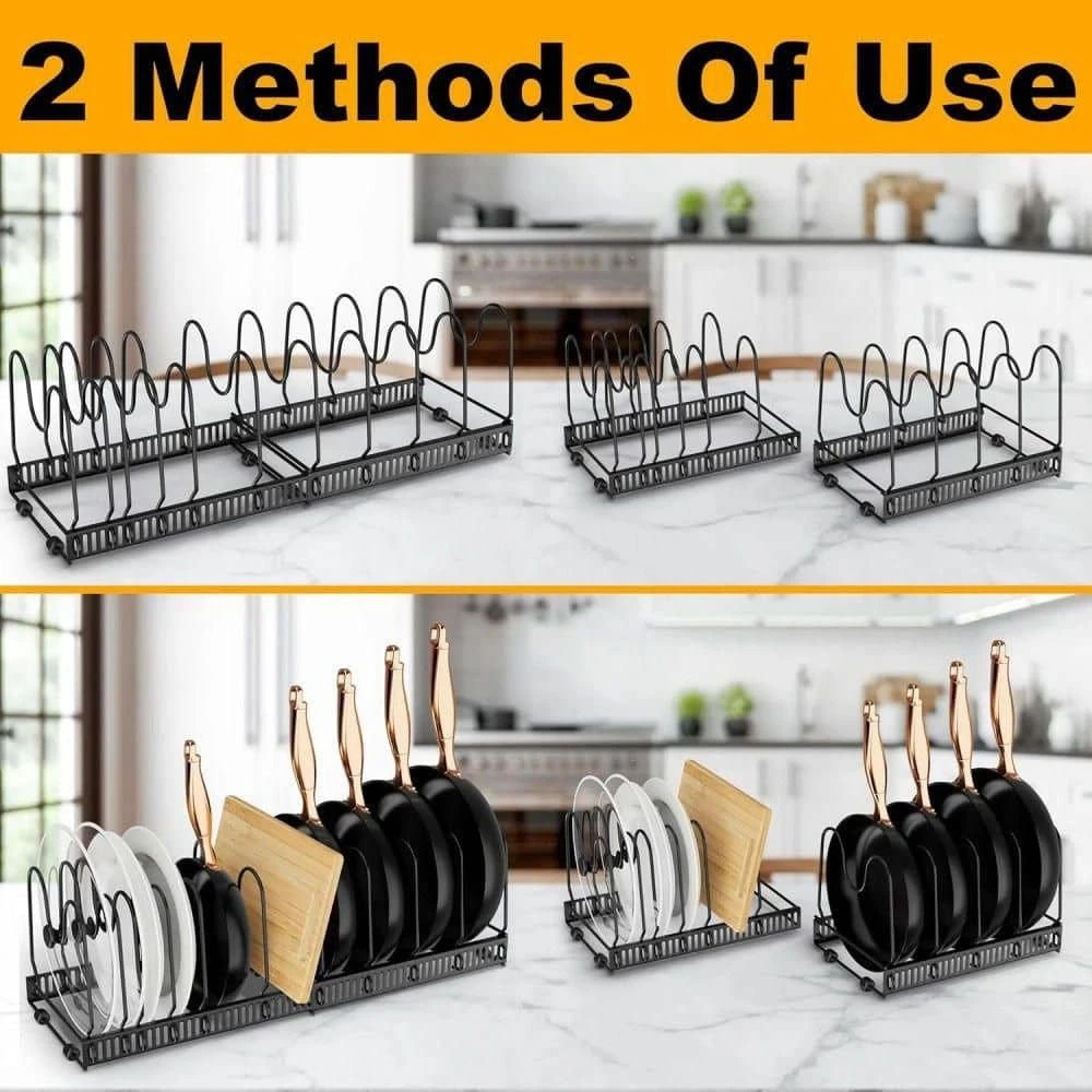 Our expandable pot and pan organizer rack helps free up kitchen cabinets, keeping countertops clutter-free while keeping essential cookware within easy reach, suitable for various sizes of pots, pans, and lids. Equipped with 10 M-shaped dividers, it provides a secure and tailored storage solution-these dividers are uniquely designed to hold lids in place, adapting to your organizational needs to create a tidy kitchen. It can stack up to 10 plus pans effortlessly, making it ideal for smaller kitchens, busy cooks, or anyone looking to reduce clutter, and is available in white, black, or bronze to complement your kitchen decor. The rack’s length is adjustable from 12 in. to 23 in. to fit your space perfectly; it can be used as a single, expansive rack or split into 2 separate pieces, offering secure and convenient storage that suits your kitchen layout. Backed by satisfactory service, we are committed to delivering top-quality products-if you encounter any issues with the rack, simply contact us for a replacement or refund.