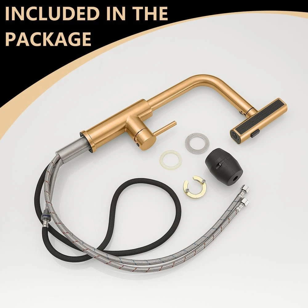 The Kitchen Sink Faucet, available in a stylish brushed gold finish, features a pull-out sprayer and is designed for both bar and kitchen use. With its 360° swivel capability, the brushed nickel faucet provides a full range of washing options for your sink, making it ideal for various applications such as bar sinks, kitchen prep sinks, bathroom sinks, and standard kitchen sinks. The pull-out sprayer comes with a counterweight to ensure it locks firmly in place, and the sprayer head automatically retracts after each use for convenience. Additionally, the faucet is equipped with 24 in. (60 cm) flexible hoses that are already installed, ensuring both ease of use and safety. It also comes with CUPC-certified ceramic components and hoses, guaranteeing high quality and reliability.