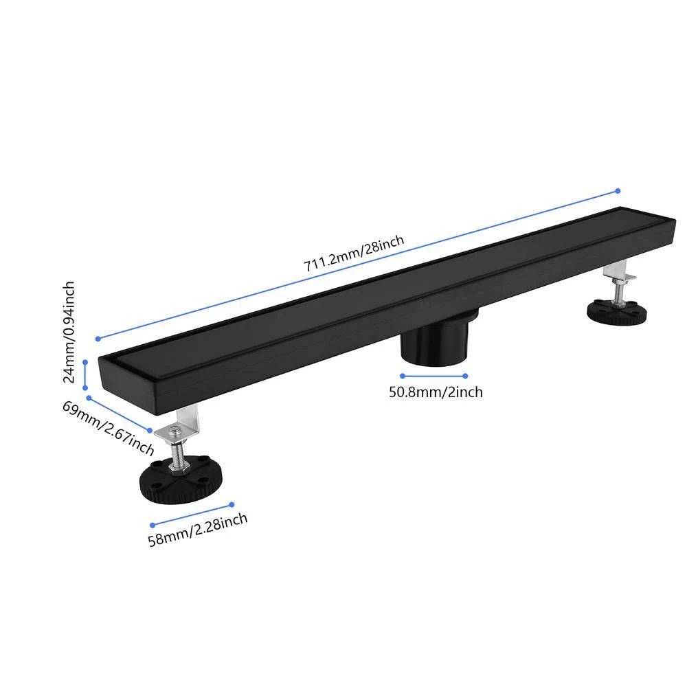 The recessed design of this drain pipe brings a clean and modern look to your space. Adjustable leveling feet support the trough, while the removable grille and hair filter make it easy to clean. This linear shower drain is designed for easy installation and fits the American drain base system. It is suitable for drainage in various places, such as bathrooms, kitchens, garages, swimming pools, basements, and other areas.