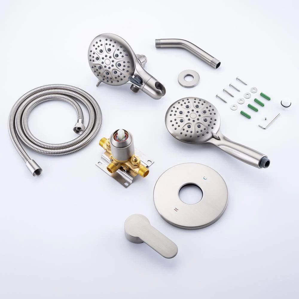 - Included: handheld shower head, 71 in. shower hose, overhead shower head, rough-in valve and trims, shower arm with flange