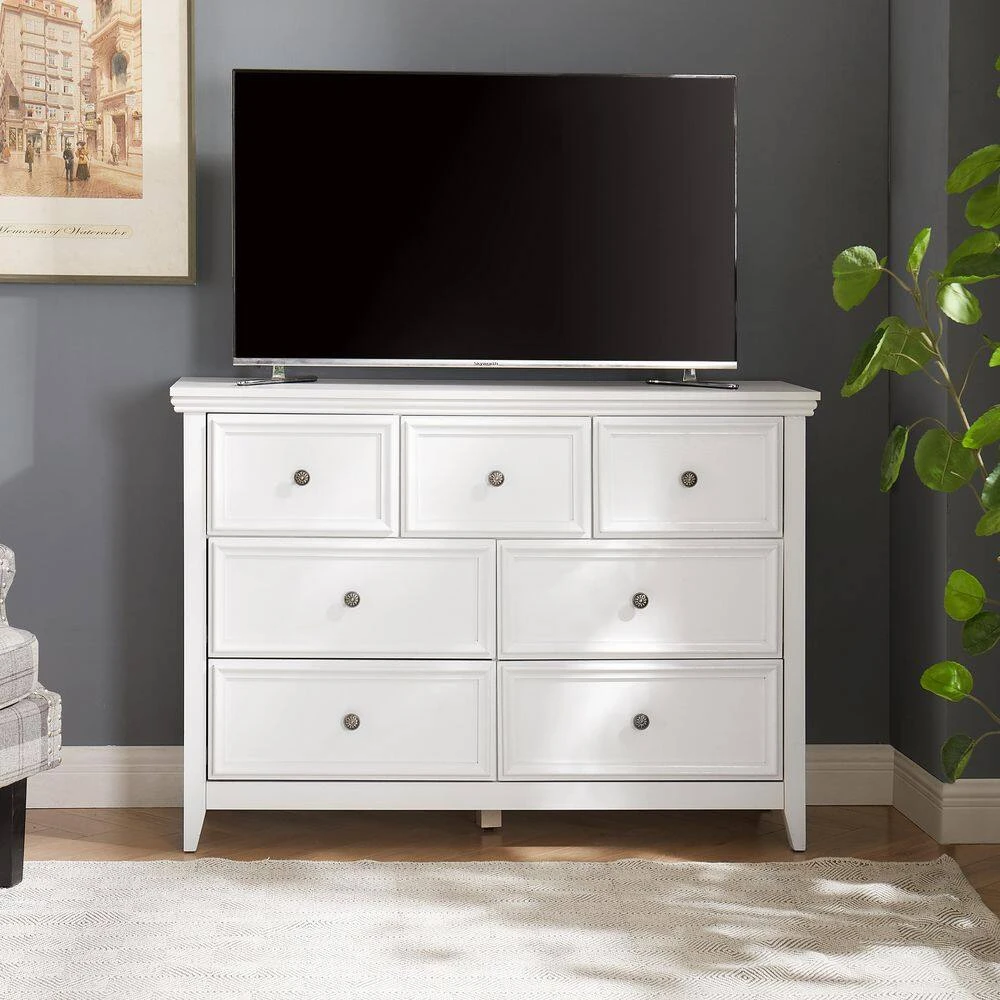 This Modern 7-Drawers Dresser, also known as a 7-Drawers Cabinet, is a remarkable addition to your living room. With 7 large drawers, it offers ample storage space. The top 3 drawers are equipped with wide slides, making it extremely convenient to store items like t-shirts, socks, or trousers, effectively freeing up more space in your living area.Quality and safety are top-notch features of this dresser. It comes with smooth metal slide rails for easy operation, and the easy-to-pull metal handles add to its user-friendliness. Moreover, each drawer is equipped with an anti-tipping device, satisfying your pursuit of both quality and safety.Measuring 47.25 in. W x 15.75 in. D x 33.66 in. H when assembled, this wood dresser has a spacious interior design. The drawers are designed in a way that they won’t collide or collapse. Additionally, the chest provides an appropriate height, making it suitable for placing a potted plant, a printer, or even a TV. Assembly is a breeze. The packaging includes instructions and an accessories bag, and all parts in your package are pre-numbered and pre-drilled. With the step-by-step manual, you can easily install this dresser, saving you time and effort. Whether you need to organize your clothes or simply enhance the storage functionality of your living room, this farmhouse-style white dresser organizer is an excellent choice.