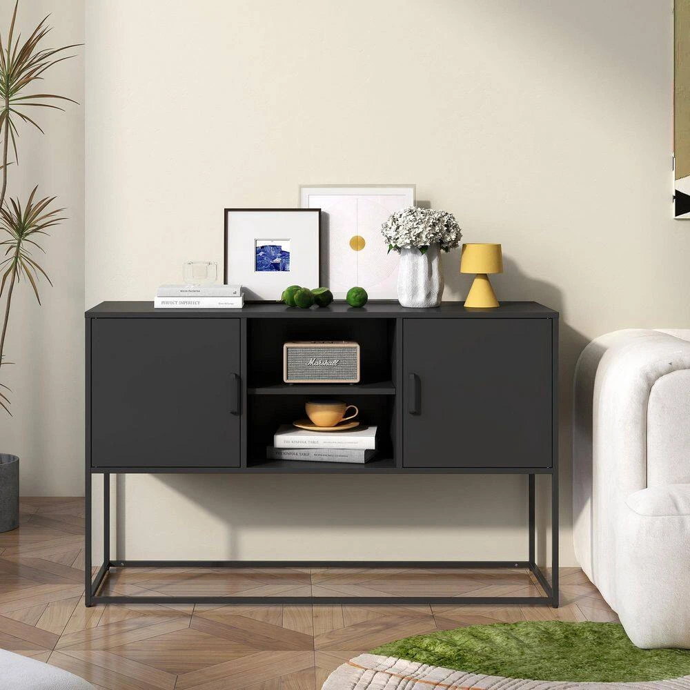 The Modern Sideboard Buffet Cabinet is a great storage option. Measuring 47.2 in. W x 15.7 in. D x 29.5 in. H with 6 compartments, it’s spacious and suitable for any room. Made of high strength cold rolled steel, it’s durable and rust resistant. The eco friendly powder coating is formaldehyde free, odorless, and easy to clean. It can be used as a sideboard, buffet, coffee bar, or TV stand. The high leg design aids maintenance, and the anti scratch feet protect floors. An anti tipping device ensures safety. With an elegant handle and magnetic silent closure, it looks sleek. It’s easy to assemble with provided instructions, gloves, and a screwdriver, and you can scan to watch an installation video.