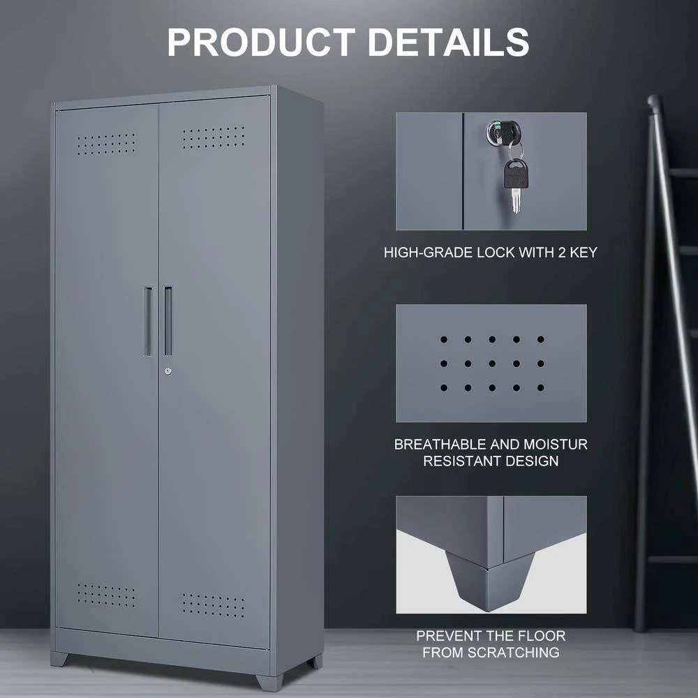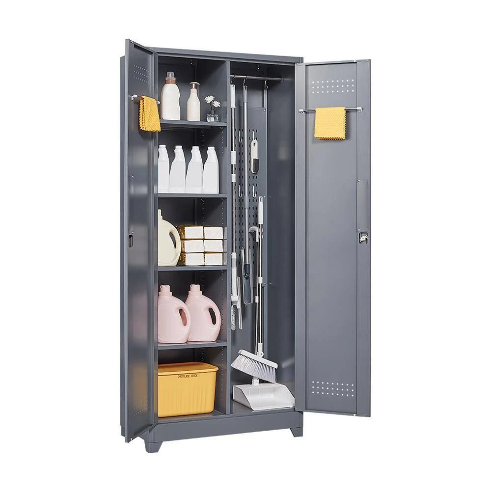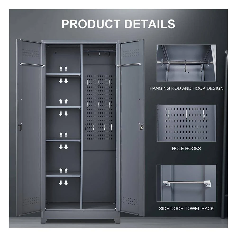 This heavy – duty storage cabinet is built tough. Made wholly of high – quality steel with a reinforced internal frame, it’s strong, stable, and can bear heavy loads. Its anti – corrosion and anti – rust treated surface ensures a long lifespan.The storage system has hanging rods and shelves, perfect for hanging tools, clothes, etc. It suits garage storage, like for cleaning tools, or as an office cabinet in the basement.Our broom closet – style cabinets have holes at the bottom to stop water pooling, so wet items can be stored safely. Ventilation holes on the door keep things dry and breathable.This locking – door metal cabinet comes with detailed instructions and installation videos for easy assembly. If you have any questions, our professional staff are just a message away to assist you. It’s a great all – around storage solution for various needs.