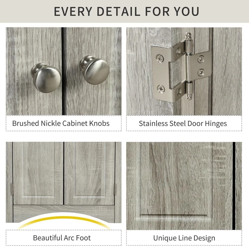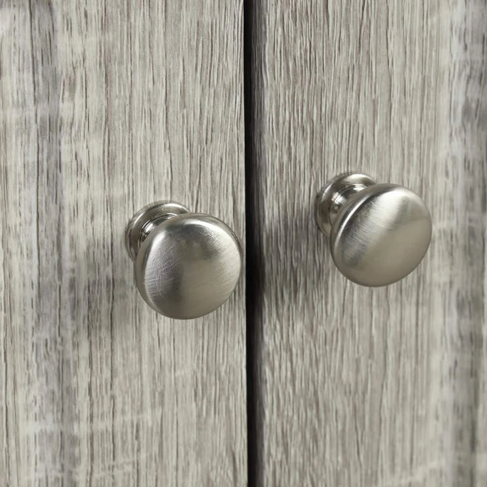 - Closed and organized storage: cabinet doors hide clutter while keeping items dry; brushed nickel knobs for easy opening/closing