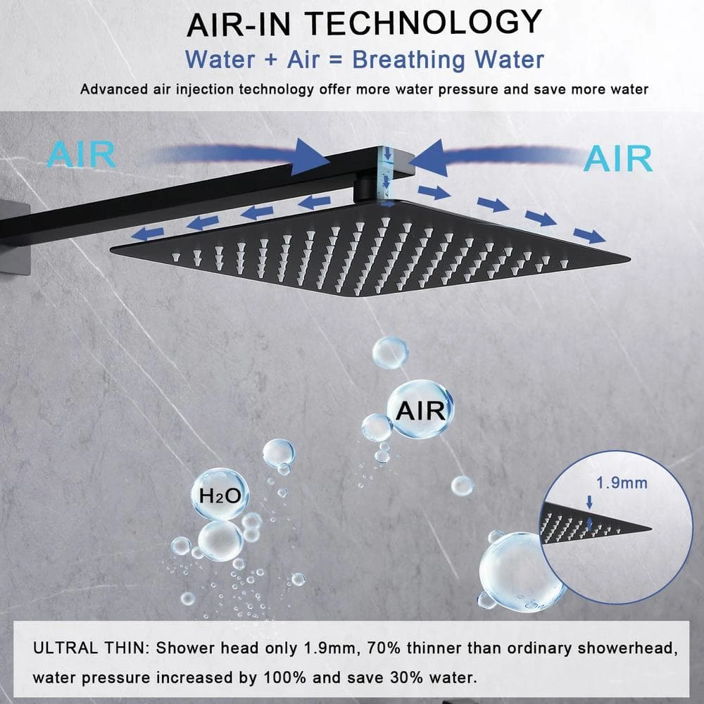 - Use of advanced air energy pressurization technology allows the shower to maintain a certain water pressure, the rain shower head can simulate natural rain and the natural touch of the skin can wash you away from fatigue