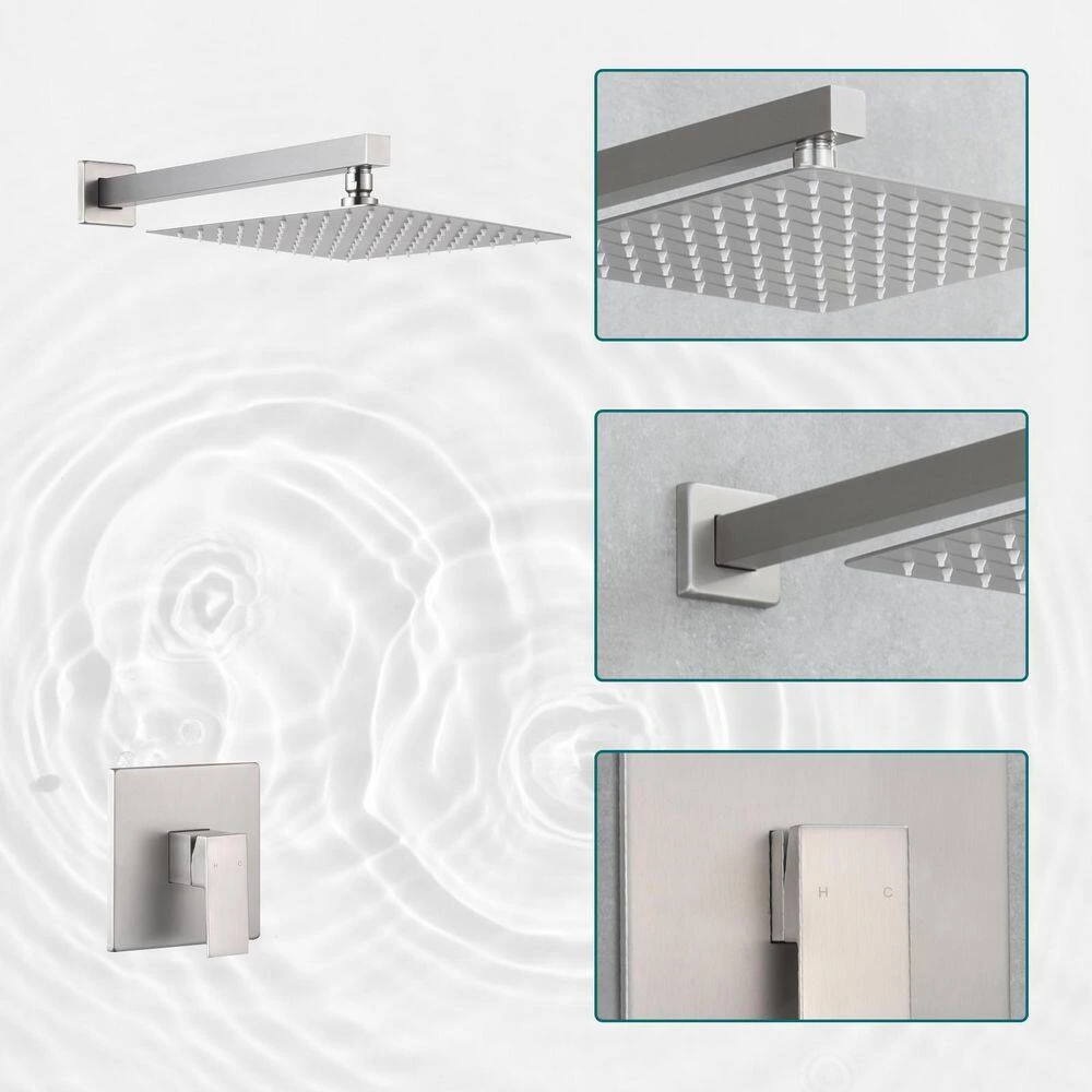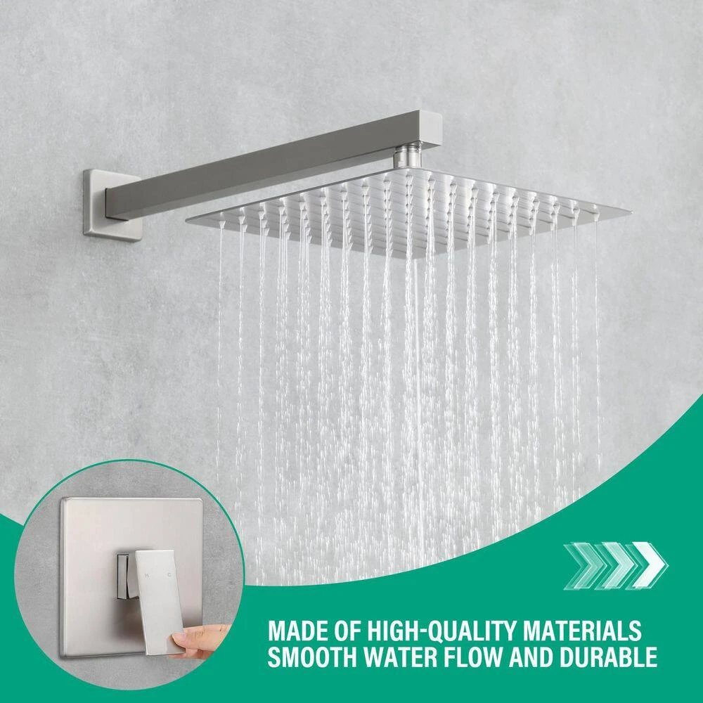 This 1-spray 10-inch square shower head features a modern and unique design that adds a touch of sophistication to any bathroom. Its spacious square shape provides a wide and luxurious water coverage, enhancing your shower experience with a refreshing, enveloping flow. The attached square handle is designed for convenience, allowing you to easily and swiftly adjust the water temperature to your preferred setting.The shower head is finished in elegant brushed nickel, which not only complements a variety of bathroom styles but also offers resistance to tarnishing and corrosion, ensuring a long-lasting, pristine appearance. The 1.5 GPM (gallons per minute) flow rate provides an efficient yet enjoyable shower experience, balancing water conservation with satisfying performance. Together, these features create a cohesive and high-performing shower system that combines style, functionality, and ease of use.