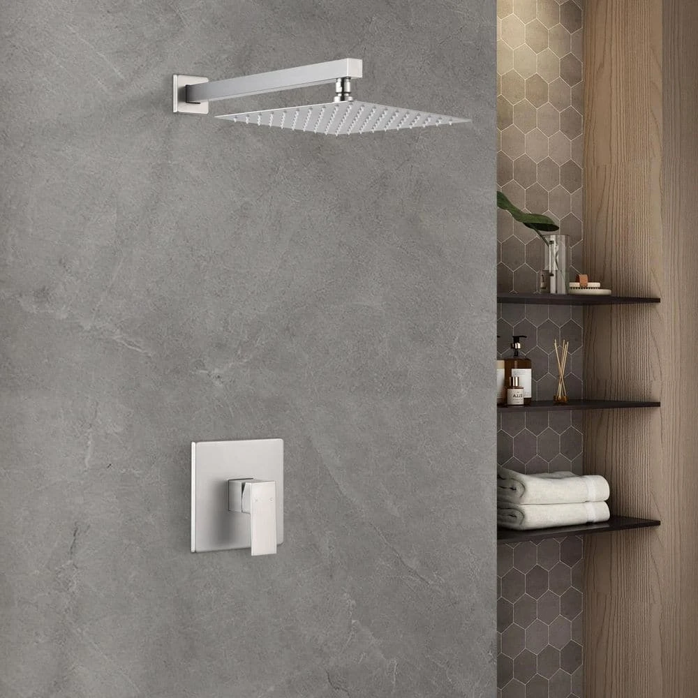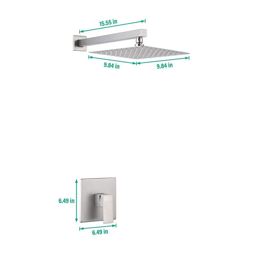 This 1-spray 10-inch square shower head features a modern and unique design that adds a touch of sophistication to any bathroom. Its spacious square shape provides a wide and luxurious water coverage, enhancing your shower experience with a refreshing, enveloping flow. The attached square handle is designed for convenience, allowing you to easily and swiftly adjust the water temperature to your preferred setting.The shower head is finished in elegant brushed nickel, which not only complements a variety of bathroom styles but also offers resistance to tarnishing and corrosion, ensuring a long-lasting, pristine appearance. The 1.5 GPM (gallons per minute) flow rate provides an efficient yet enjoyable shower experience, balancing water conservation with satisfying performance. Together, these features create a cohesive and high-performing shower system that combines style, functionality, and ease of use.