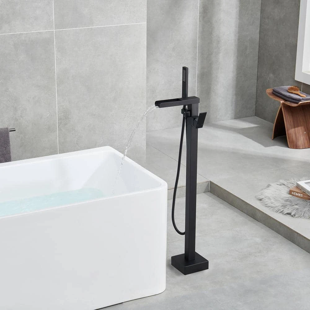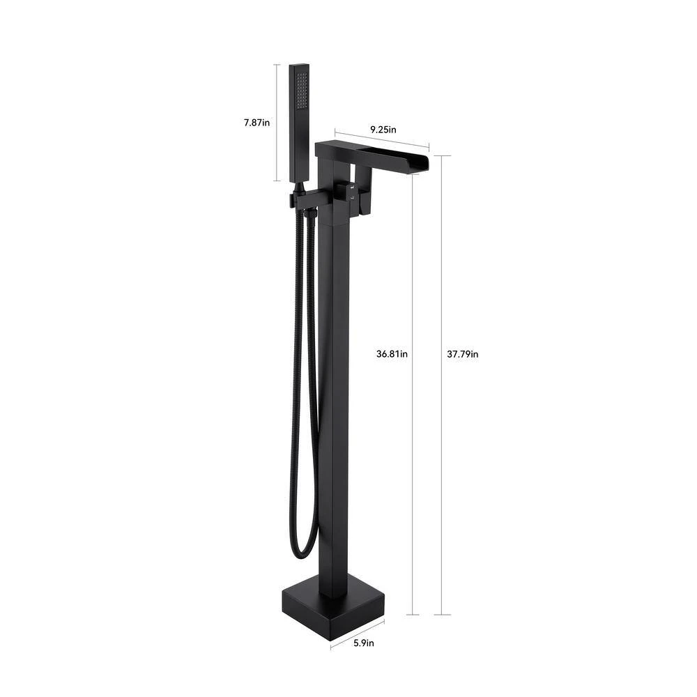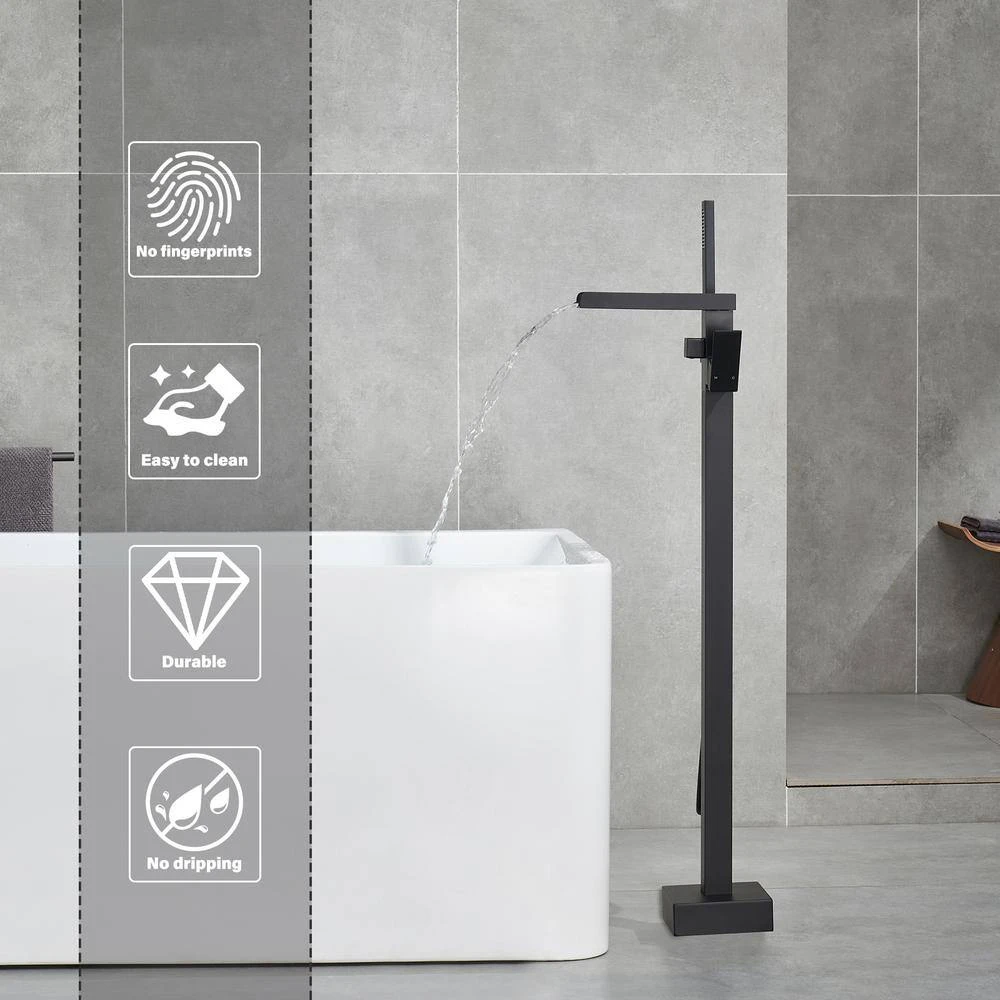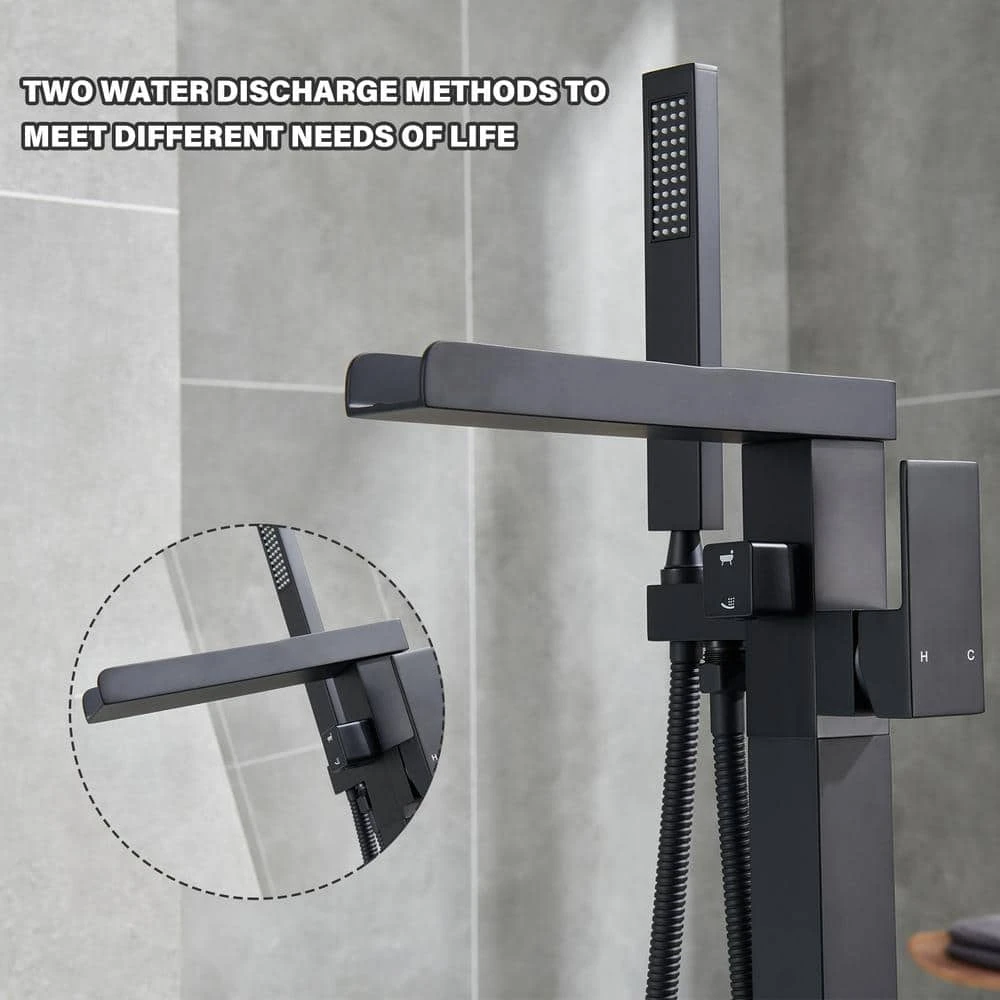 The main body of the bathtub faucet and the hand shower hose are crafted from high-quality stainless steel, ensuring durability and a long service life. Highlights include a modern waterfall spout design that seamlessly integrates with the faucet for a beautiful aesthetic. The multipurpose hand shower features a 59 in. stainless steel hose, known for its durability, corrosion resistance, and easy installation. Lever handles are designed for effortless water flow and temperature adjustments. The faucet comes with rough machining and all necessary mounting hardware for floor bolting, ensuring stability and facilitating a safe and efficient installation process. Additionally, the handheld shower with its hose is ideal for rinsing off after a bath or for bathroom cleaning tasks.