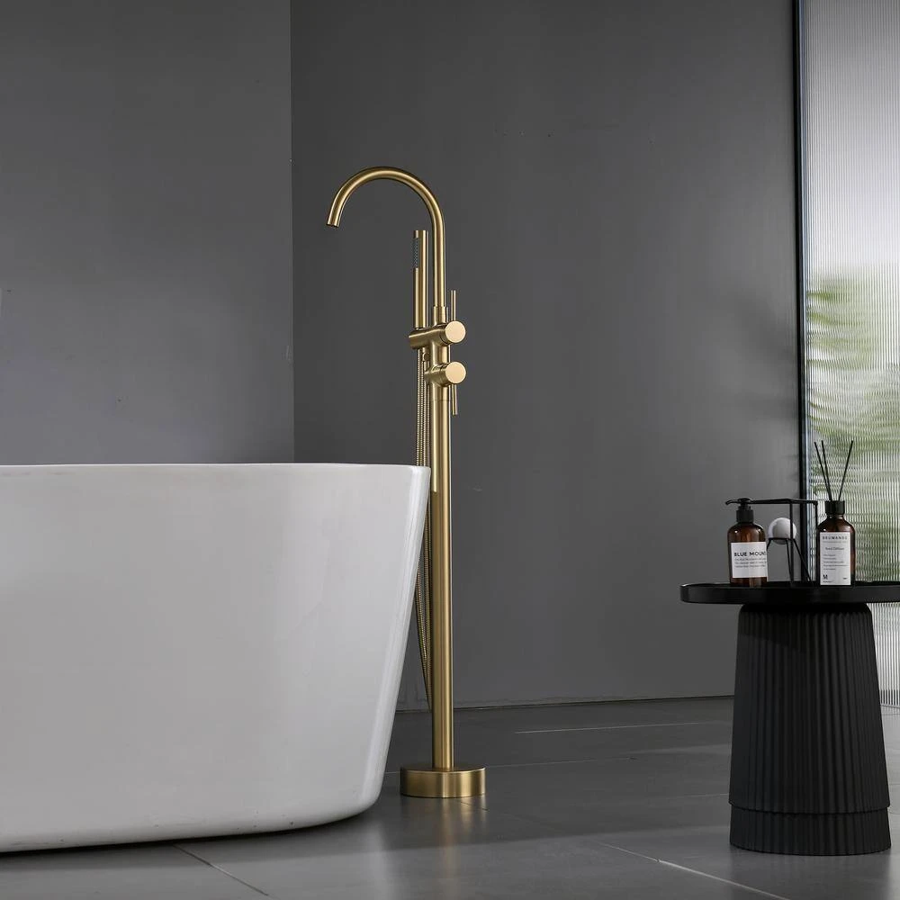 This freestanding bath faucet with shower has a luxurious and elegant appearance and can be the highlight of your bathroom design. This outstanding metallic finish resists fingerprints and water stains, maintains the shine of the original finish and wipes clean easily with a soft towel. This Roman style floor-standing bath faucet saves space as they do not require a deck around the edge of the tub, which is particularly beneficial in smaller bathrooms. This floor-standing faucet can match your bathroom and make it more elegant.