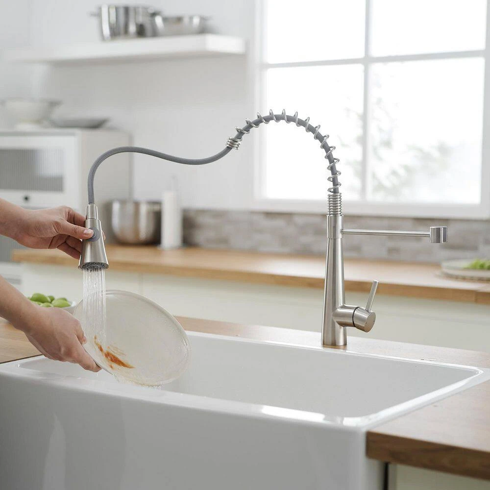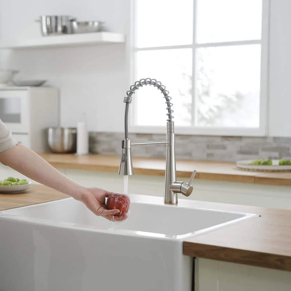 Transform your kitchen into a haven of style and functionality with our remarkable pull out kitchen faucet with sprayer. Meticulously crafted from top – tier 304 stainless steel, with a matching 304 stainless steel handle, this commercial kitchen sink faucet is a testament to enduring quality. Dive into the luxury of choice with our 2-captivating finishes. With a simple, intuitive push of a summary, you can seamlessly switch between a stream and spray that’s a force to be reckoned with when it comes to tackling stubborn stains and grime. And the best part. The pull – out sprayer extends a generous 20 in. reaching into every nook and cranny of your sink, making even the most hard – to – reach areas easily accessible. Plus, with a full 360° rotation, you have complete freedom to direct the water exactly where you want it, eliminating any awkward angles or frustrating limitations. In no time at all, you’ll have this stunning faucet up and running, ready to elevate your kitchen experience to new heights.