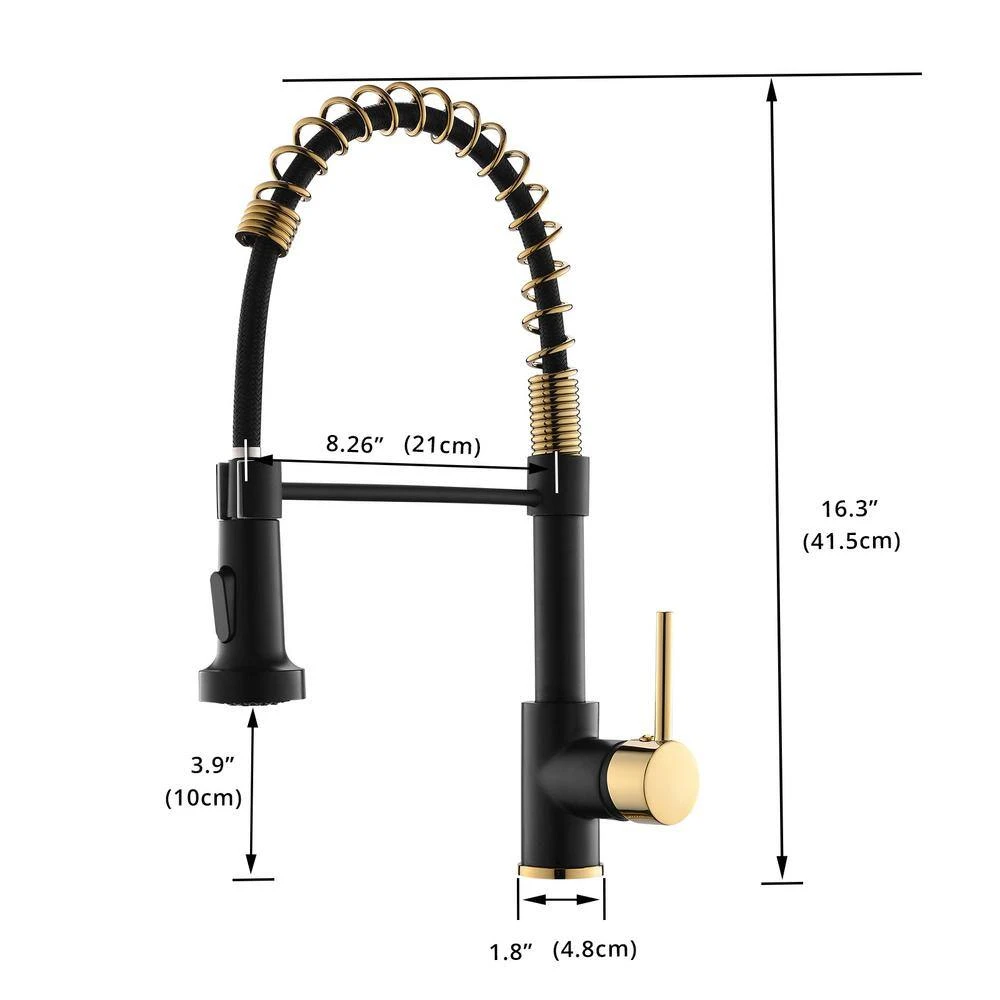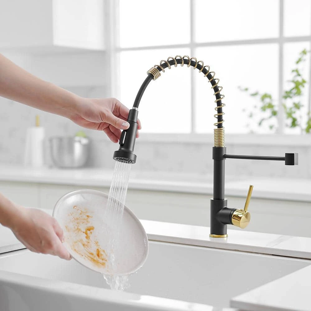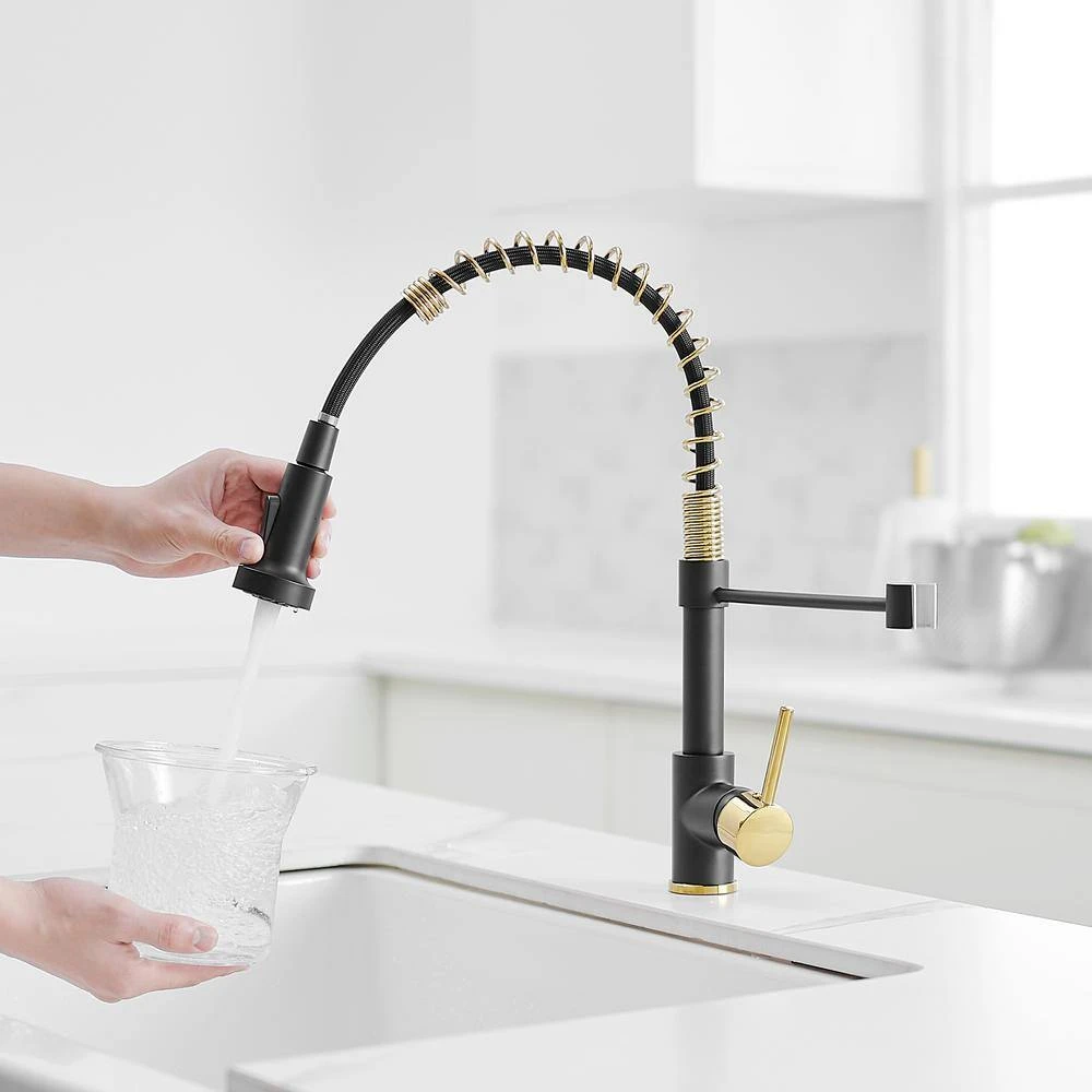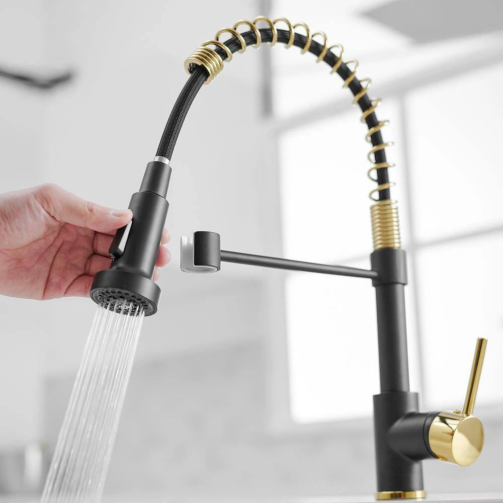 This modern kitchen faucet boasts a sleek black and titanium gold design, featuring a flexible coil spring spout and 3-function sprayhead for versatile use. with easy installation and operation, including a 360° swivel spout and single handle control, it offers convenience and style to elevate any kitchen space. Plus, it includes dual-mode settings for stream or spray, catering to various cleaning needs with stable water pressure and easy maintenance.