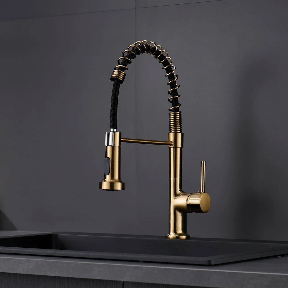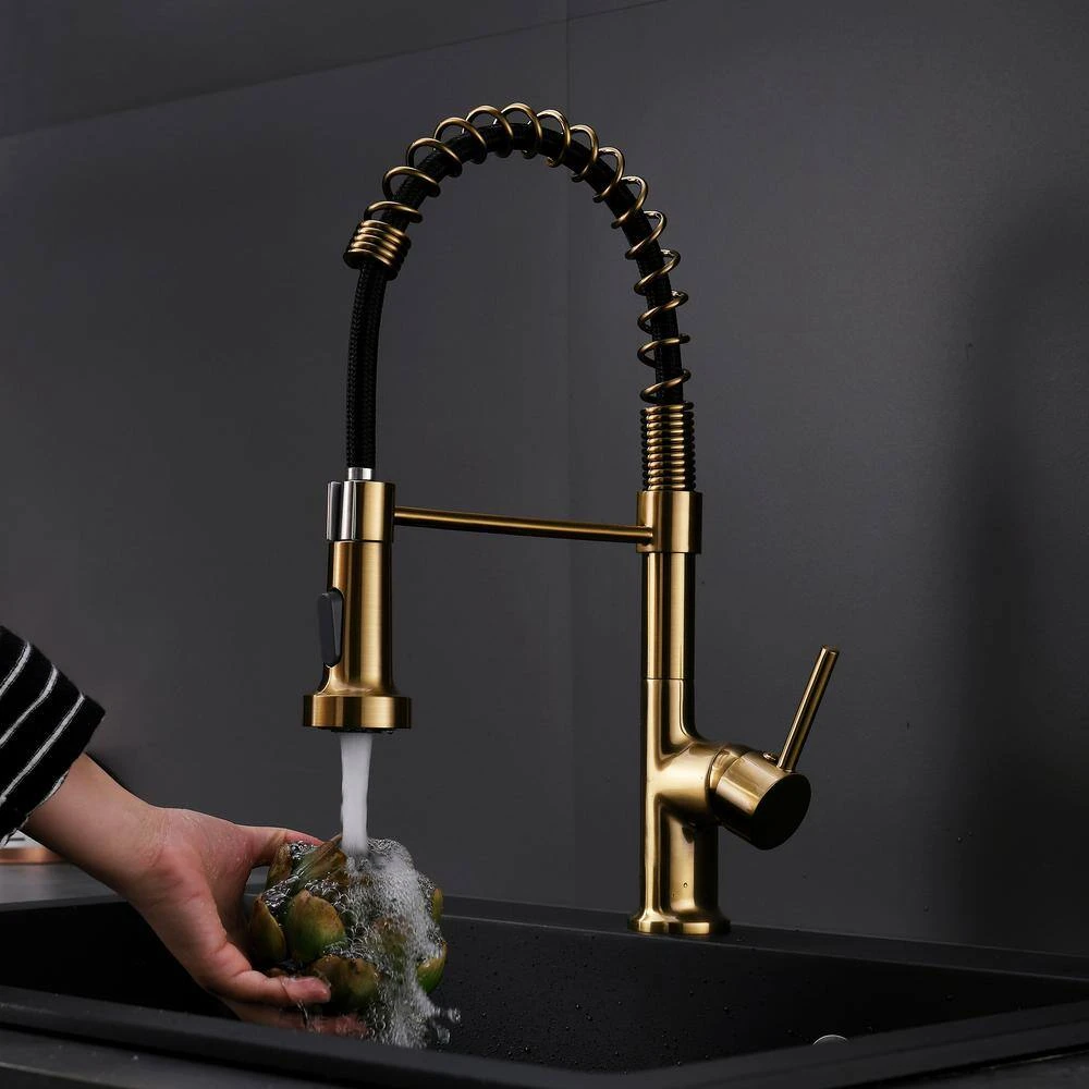 The Brushed Gold Kitchen Faucet with Sprayer features a captivating industrial design with a high-arc open coil spout, fitting compactly underneath most kitchen cabinets for added convenience. Its powerful spray function, activated by the lever on the spray head, simplifies cleaning and dishwashing tasks, while the swivel spout releases an aerated stream for quick cookware filling, transforming your kitchen into a high-end culinary workspace. Additionally, with easy installation and operation, including a 360° swivel spout, pull-down sprayer and single-handle control, it offers versatility and convenience for any kitchen setup.