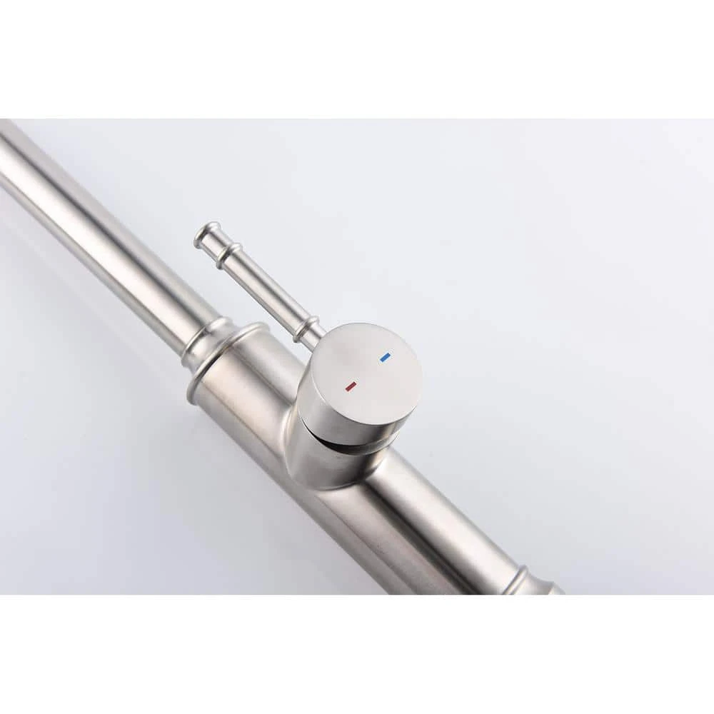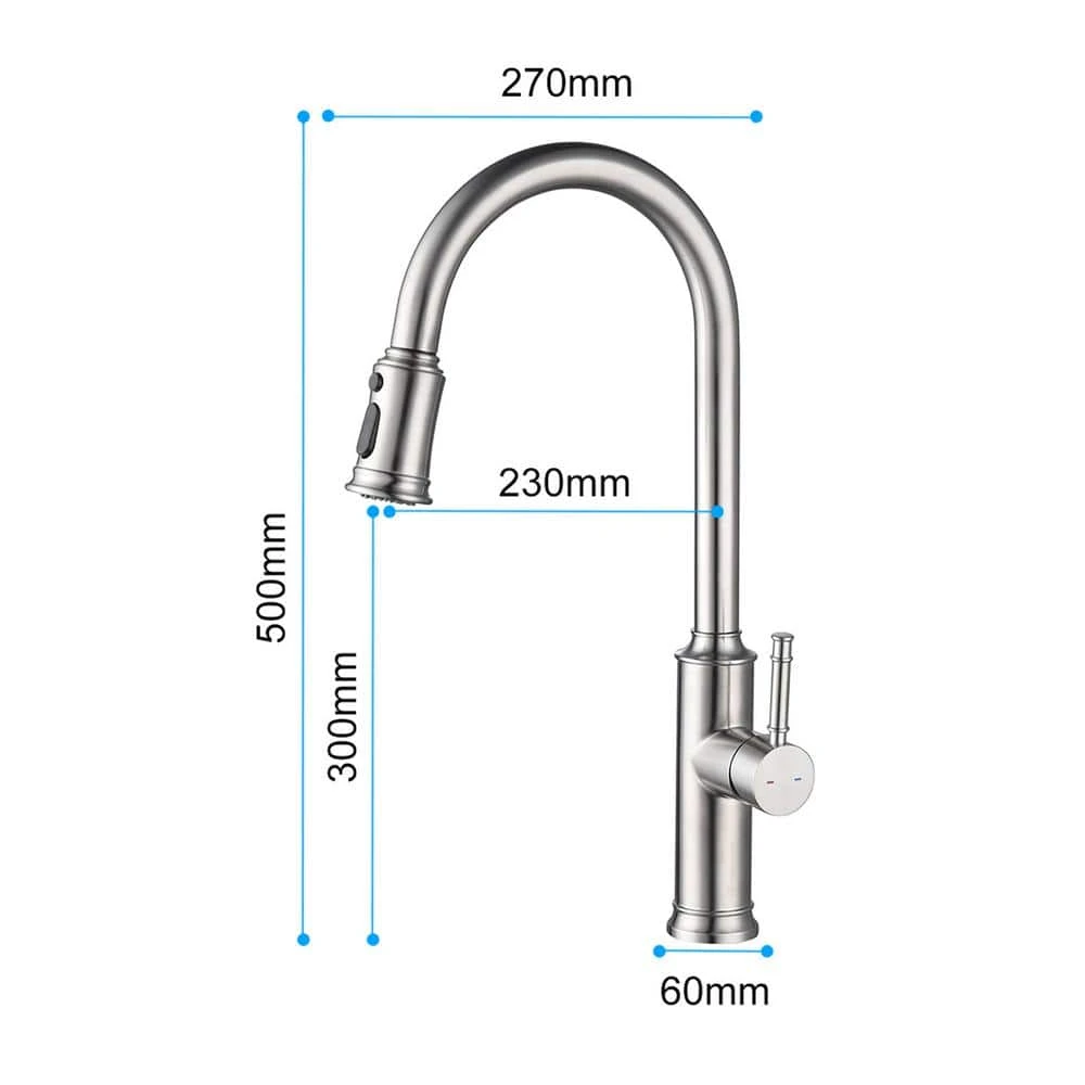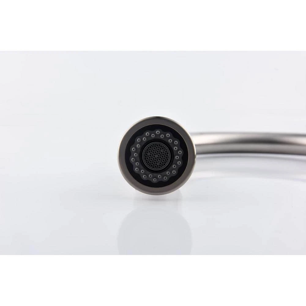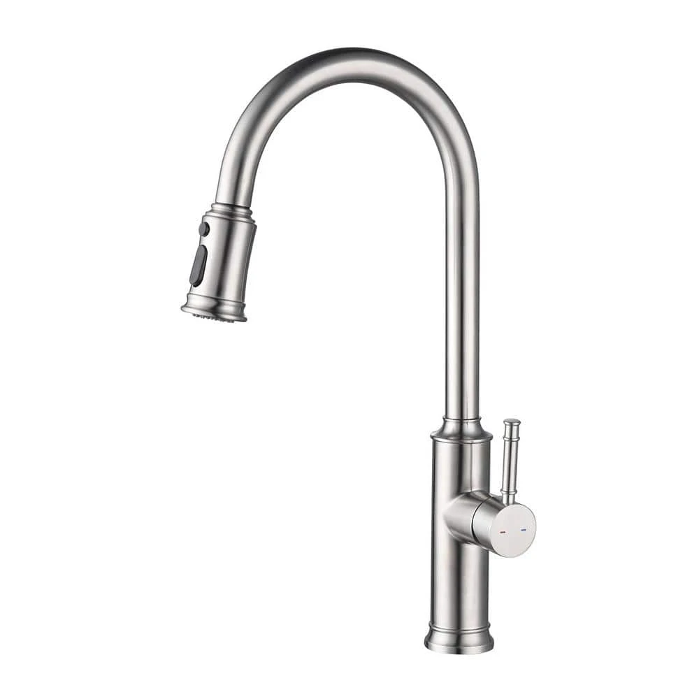 The kitchen faucet with pull-down sprayer features a versatile design that effortlessly complements most sinks. It includes 3-water output settings (stream, spray, and pause) to accommodate different tasks such as washing dishes, filling water, or rinsing fruits and vegetables. The high-arc nozzle rotates 360° for comprehensive cleaning coverage, while the single-handle control ensures easy adjustment of water temperature and flow rate. Its high-quality anti-corrosion and anti-rust surface treatment prevents dirt buildup, requiring only a simple wipe with a rag for daily maintenance to keep the faucet looking like new.