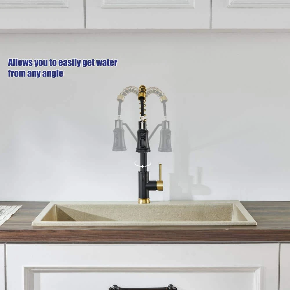 The commercial kitchen faucet is designed to bring a striking industrial aesthetic to your kitchen while maintaining practical functionality. Its high-arc open coil spout not only adds visual appeal but also ensures ample space for cleaning large cookware. Despite its robust design, the faucet’s compact height allows it to fit seamlessly under most kitchen cabinets, making it a versatile choice for any kitchen layout. The faucet features a powerful spray function, easily activated by pressing the lever on the spray head, which simplifies the task of washing dishes and cleaning. Additionally, the swivel spout offers an aerated stream, ideal for filling pots and pans swiftly and efficiently. Crafted from lead-free solid brass, this faucet promises durability and long-lasting reliability, transforming your kitchen into a high-end culinary workspace.