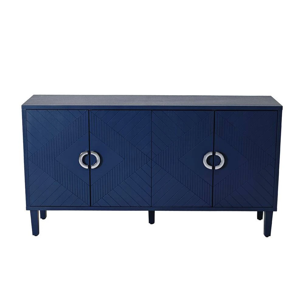 This storage cabinet features a durable construction made of high-quality MDF with solid wood veneer and pine legs, ensuring long-lasting use for all your storage needs. With its contemporary and concise style, accentuated by sculpted lines, zinc alloy semi-circular pulls, and a navy blue color scheme, it perfectly matches most home decor and showcases a minimalist and stylish appearance. Versatile for storing clothes, files, tools, and other items, the cabinet boasts a reasonable and practical load-bearing capacity, with the tabletop supporting up to 80 lbs. and the cabinet layer board supporting up to 60 lbs. Please note that due to lighting, monitor display, and manual measurement, there may be slight variations in color and size.