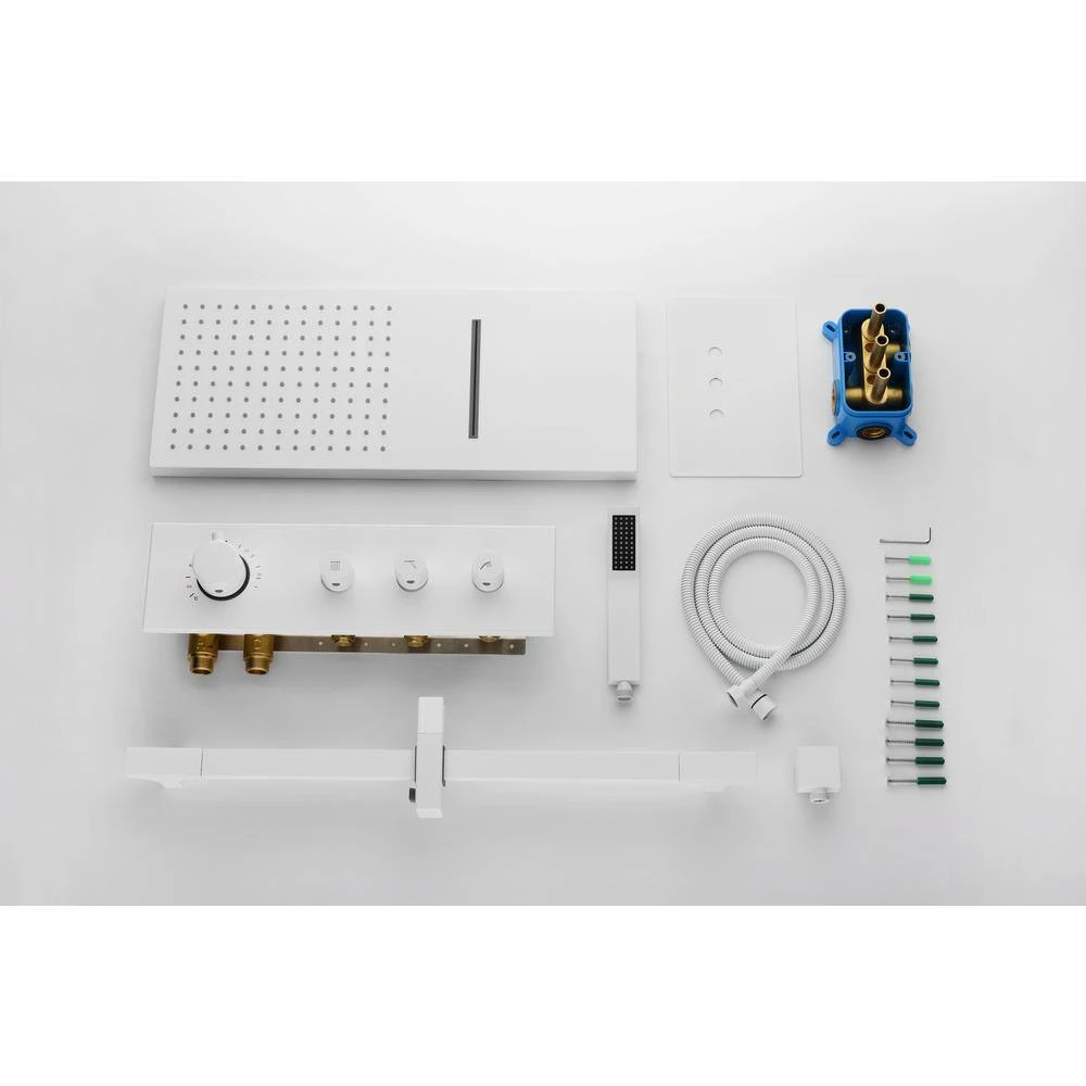 The Ceiling Mount Shower Faucet Set offers a high-pressure spray with a multi-shower head system, featuring Rain, waterfall and mist shower modes for a complete shower experience. It is both safe and practical, with the ability to use all functions simultaneously or separately. The shower head is equipped with self-cleaning silicone nozzles to prevent clogs and ensure easy maintenance. The set is designed for ceiling-mounted installation.