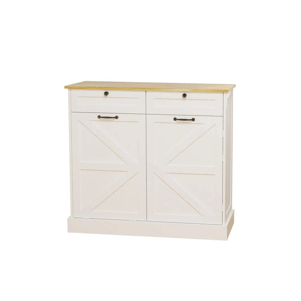 This white E1 MDF trash cabinet is a modern and versatile addition to any kitchen, dining room, or living space. Its fashionable design suits various decoration styles and can function as a kitchen island, laundry box, recycling station, or dedicated trash can storage. The cabinet features a wide tabletop ideal for small appliances like coffee machines and microwave ovens, complemented by 2 drawers for storing knives, cutlery, and tablecloths. A key highlight is the hidden tilt-out trash cabinet designed to accommodate 10-gallon trash cans, effectively concealing waste to maintain a tidy and odor-free kitchen while preventing pets from knocking over trash cans. Additionally, there’s a cabinet with a storage rack door and three-tier shelving, providing ample room for organizing drinks, canned food, dry goods, or containers. Crafted from high-quality E1 MDF with a UV-painted surface, this cabinet undergoes three painting processes to ensure an environmentally friendly, non-toxic, and durable finish that emits nearly zero carbon dioxide. The waterproof surface coating further enhances its longevity and ease of cleaning. Stability and safety are prioritized with an anti-tip design that securely attaches the cabinet to the wall, protecting your family. The package includes a detailed assembly manual along with all necessary hardware and pre-drilled/pre-cut components for easy assembly.